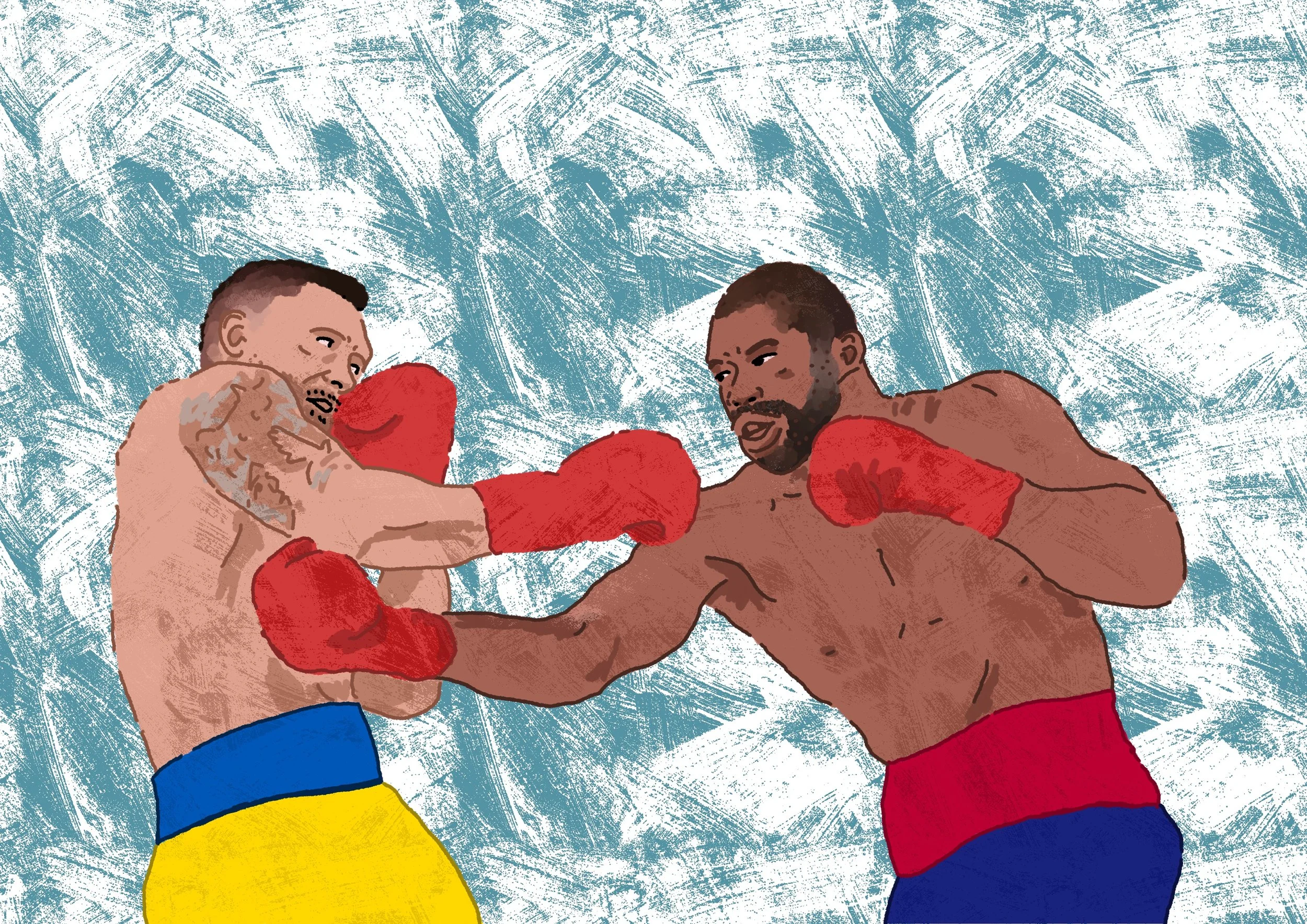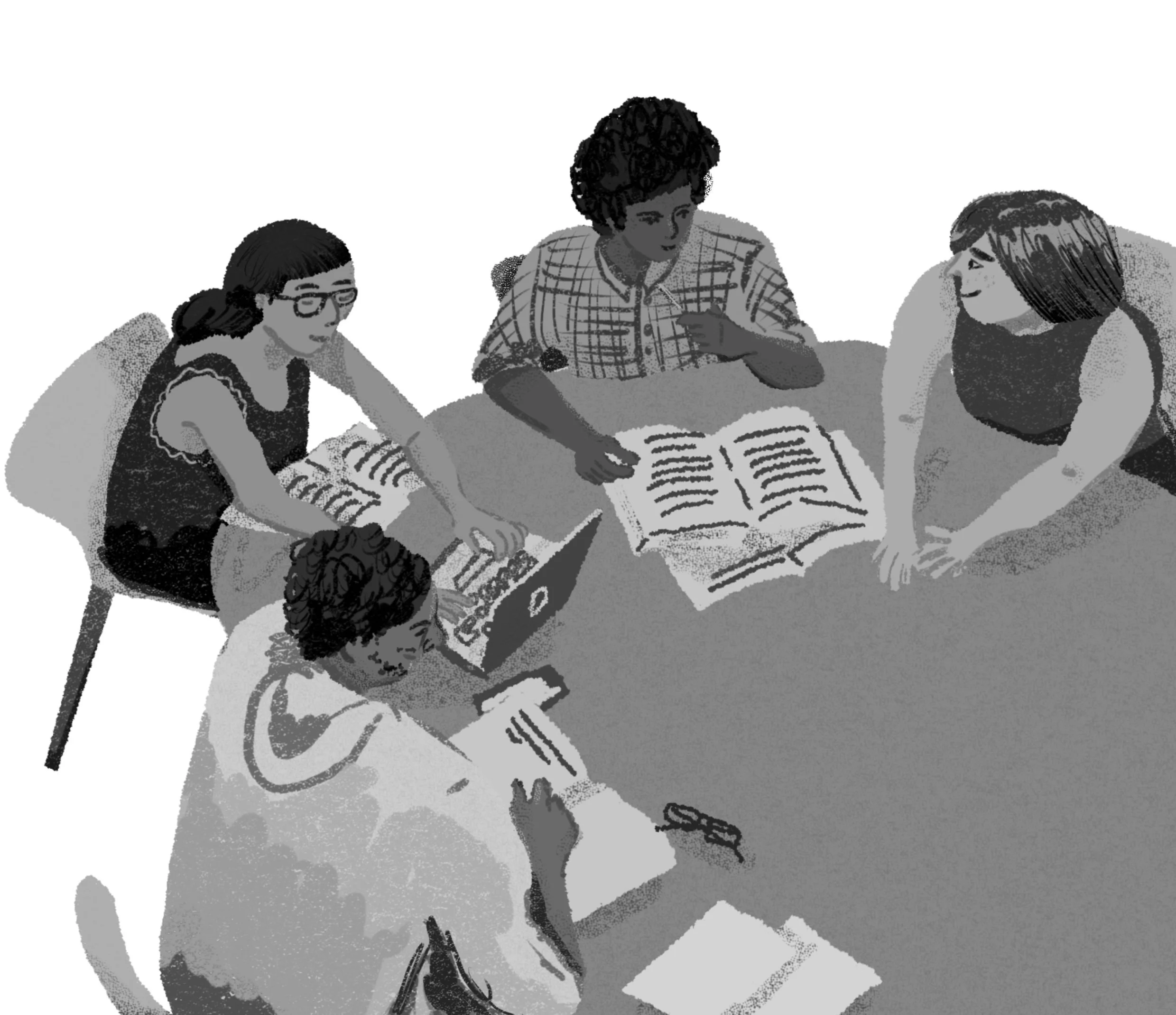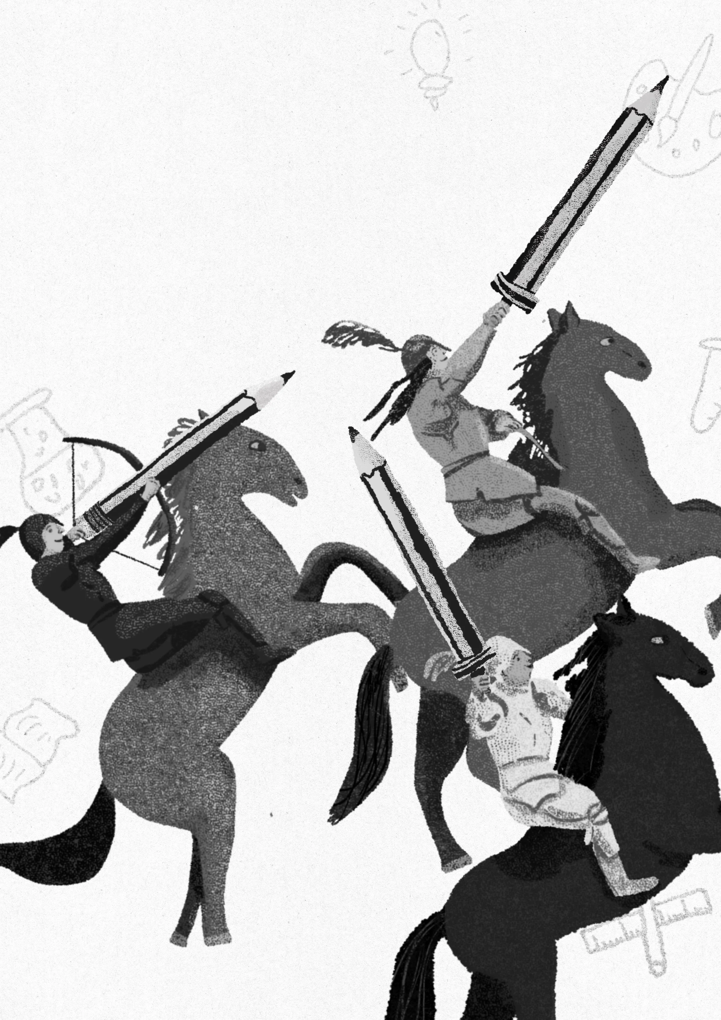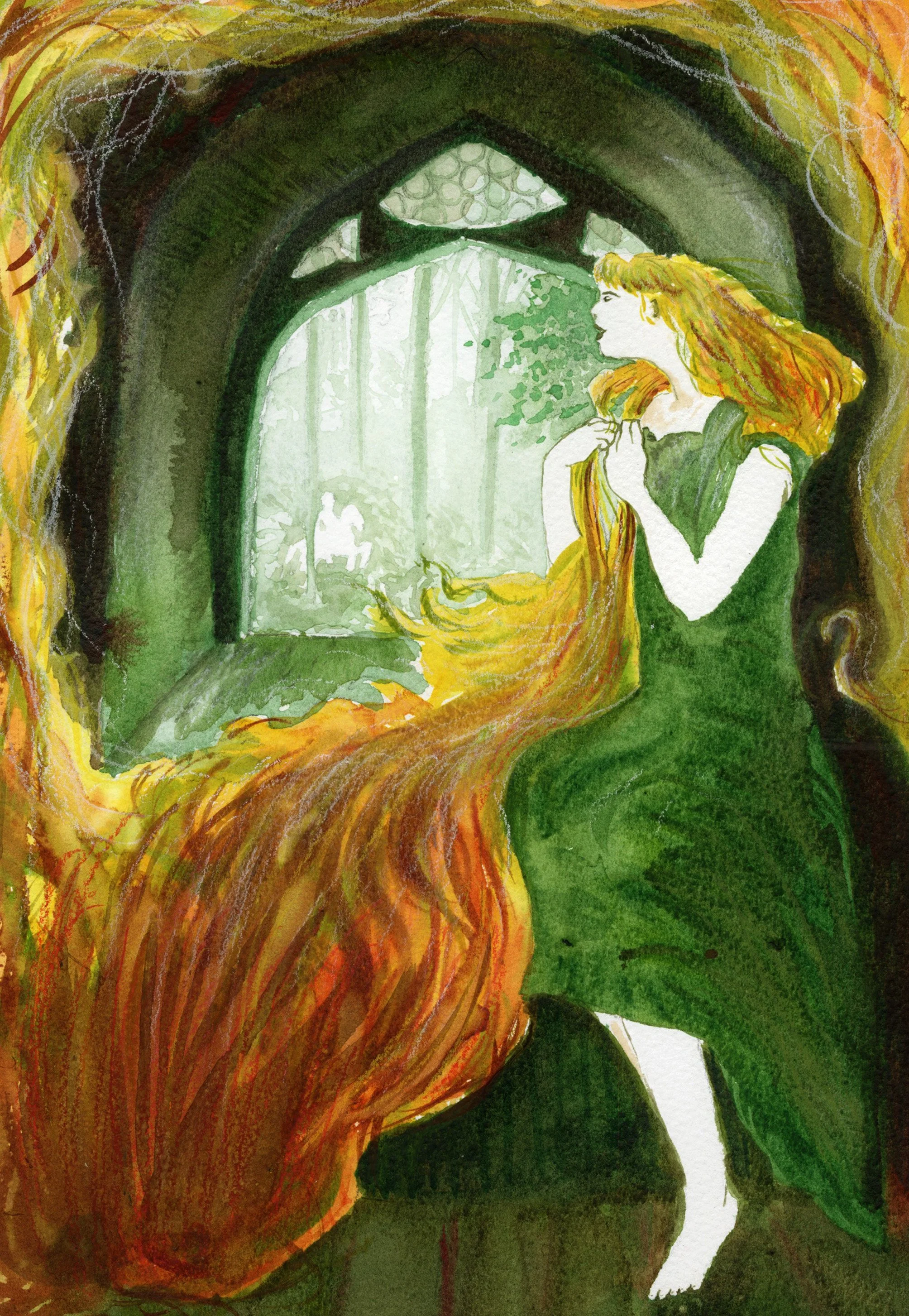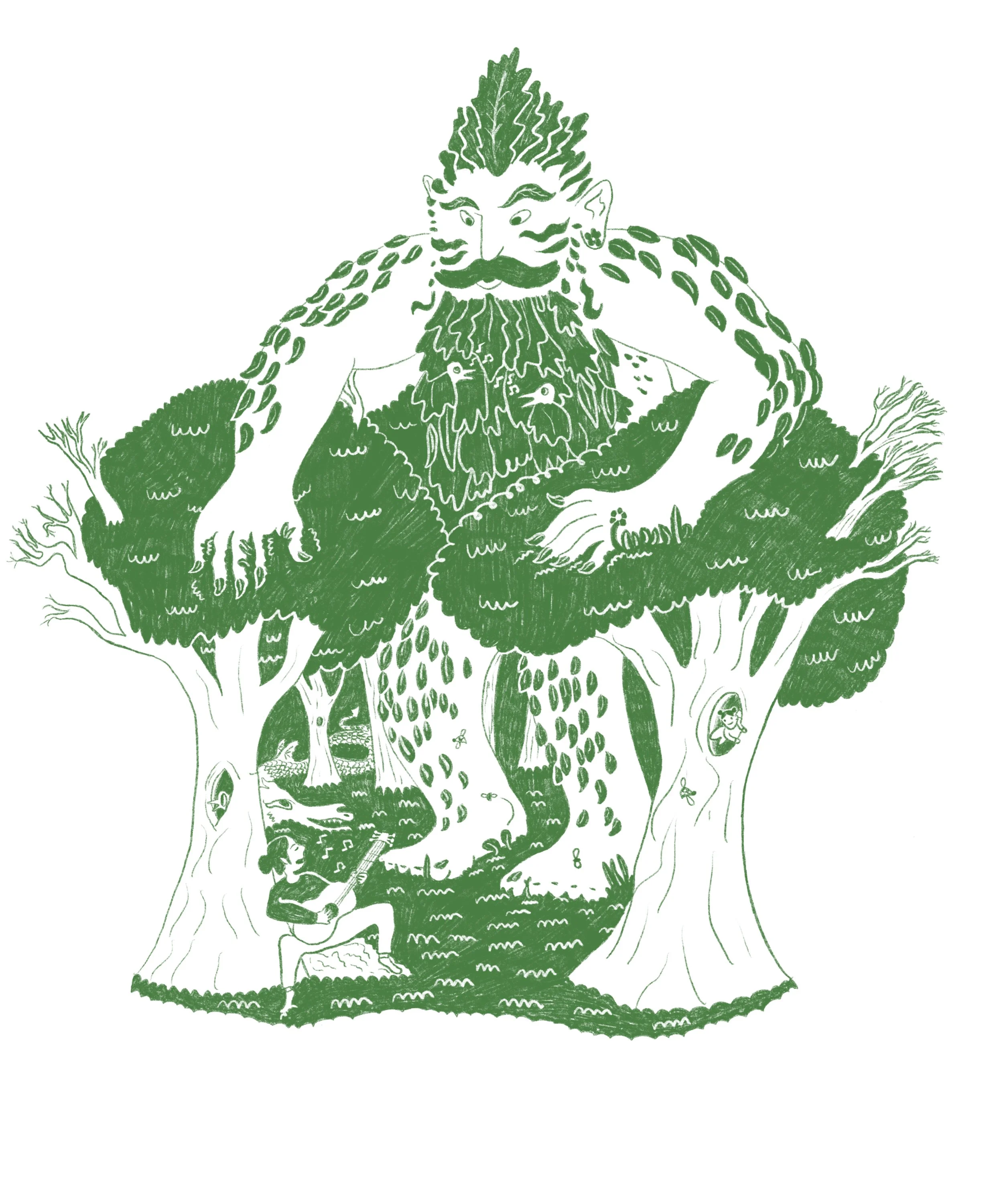Charcoal drawing of two figures holding hands among trees. View fullsize